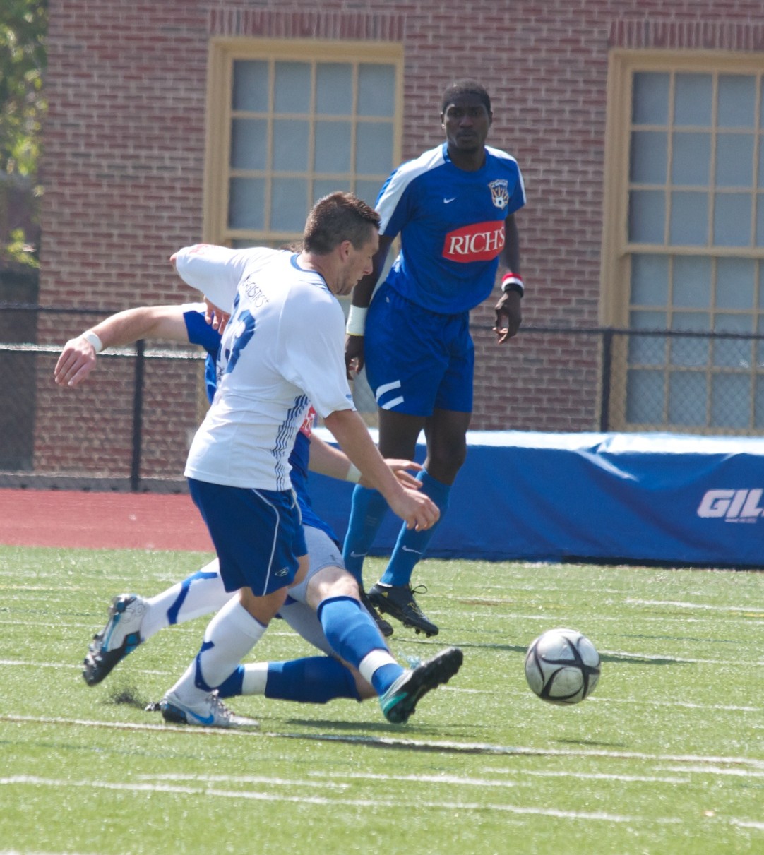 There were four yellow cards issued in the chippy affair, one to Erie and three to Buffalo (Matt Stedman, Mike Unwin, Andrew Larracuente. No card was levied on Cory Phillips after a tackle in the 18, but Erie was awarded a penalty kick and Latifi converted. Buffalo.com photographer Nate Benson caught the pivotal sequence here: